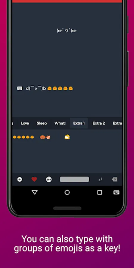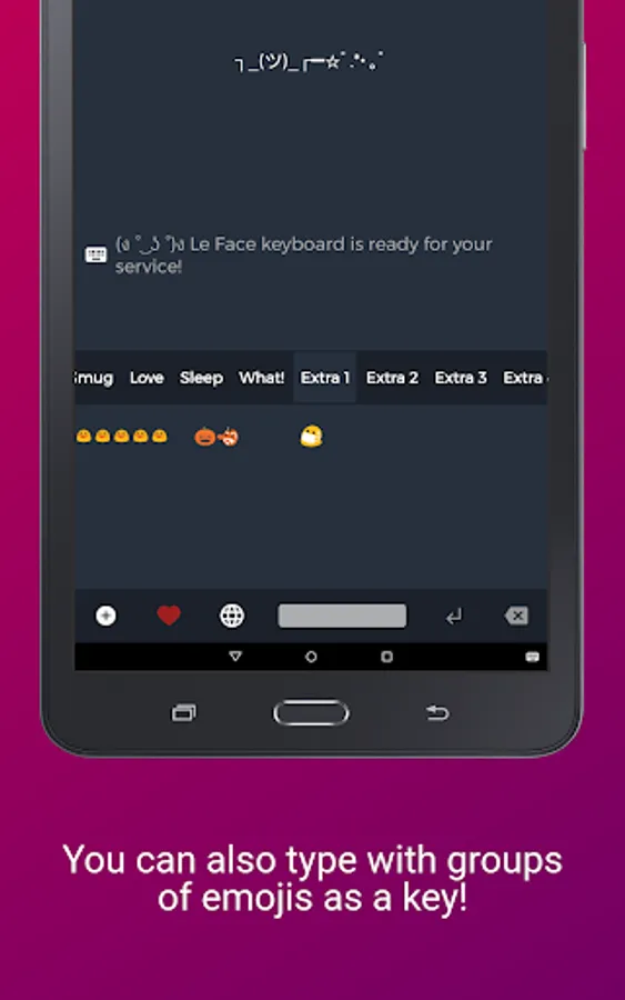 ⁍ Build your own collection: Do what you like! You can remove existing keys, add more, rename categories, add a complete sentence as a key, have groups of emojis as keys and use them from Le Face Keyboard!
