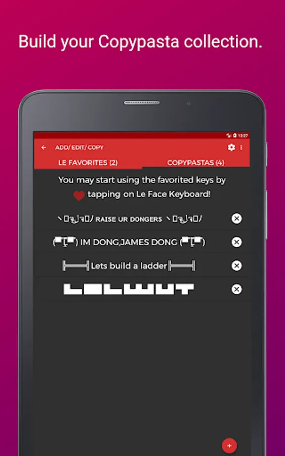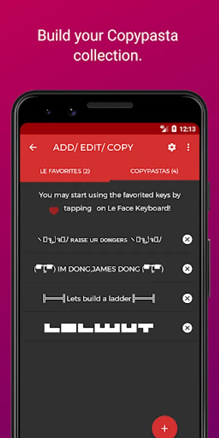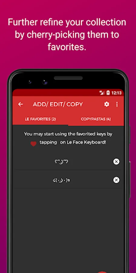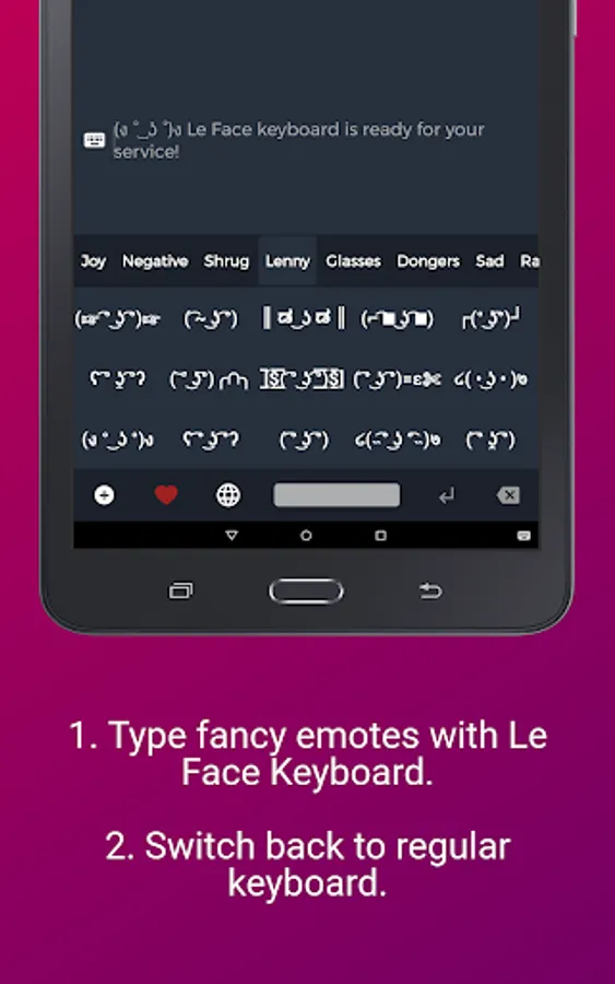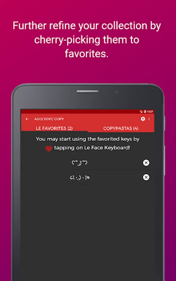 ⁍ Le Favorites: A special section to shortlist and dump all fancy texts, emoticons, custom emoticons, a chain of emotes, custom messages, unicode memes, text faces, favorites and copypasta and use them right from the keyboard. You can favorite keys long-pressing a key OR collect more from the internet!