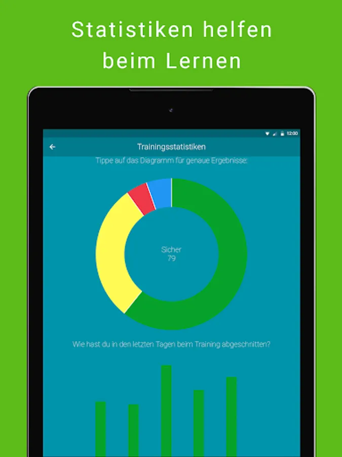Keep the full overview in learning mode. Learn all official questions based on a modern traffic light system. If the question is red, you still have to practice. If it is green, you are ready for the exam. There is also all information in a statistics overview.