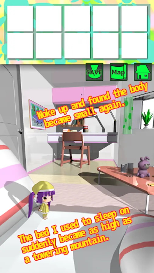 This is a room escape game based on a girl with her shrunken body takes on an adventure in the room to find her original body back.