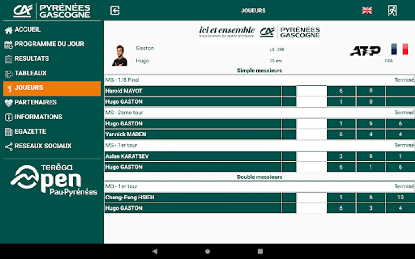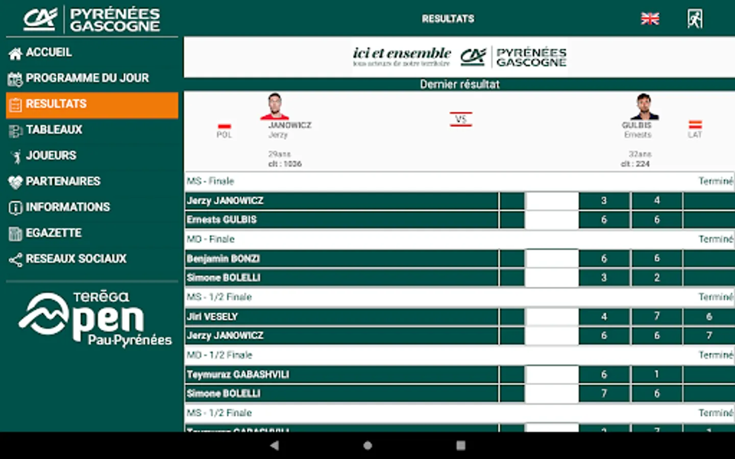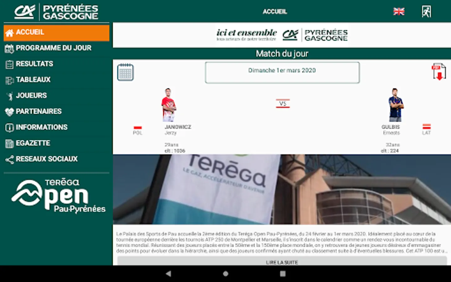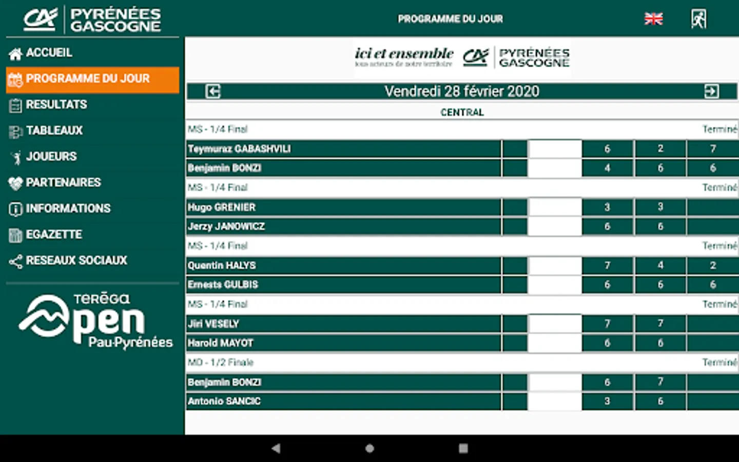 topp is an application developed in collaboration with Crédit Agricole Pau Pyrénnées. All the results, the tables as well as the program of the day of the challenger Téréga Open Pau-Pyrénées are there. You will find the list of partners, useful information as well as a daily game.