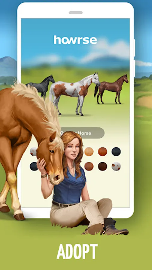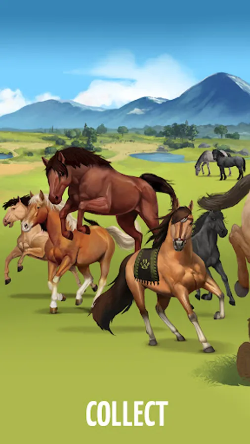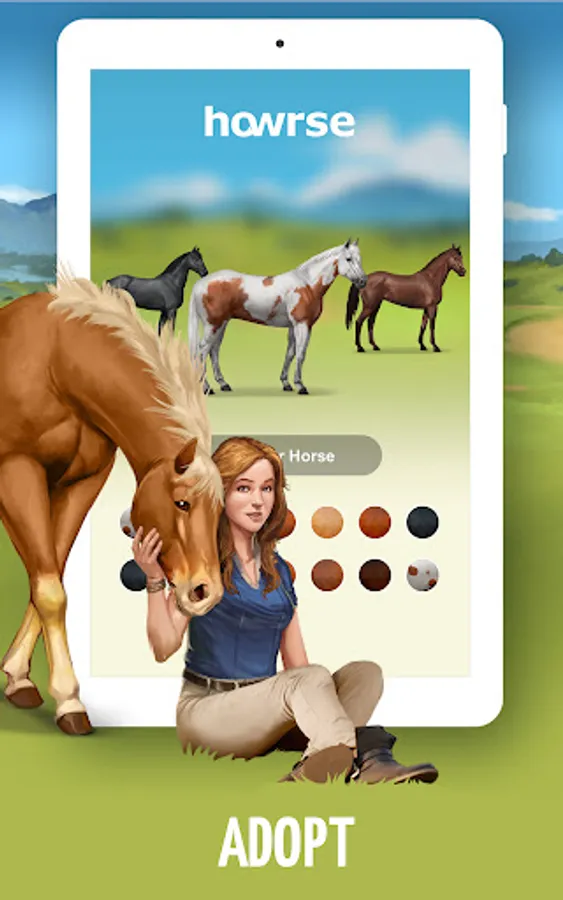 Choose your horse from over 50 breeds (purebred Arabian, Fjord, French Riding Pony, Shetland…) with 17 different coats. You can even choose ponies, donkeys or unicorns.