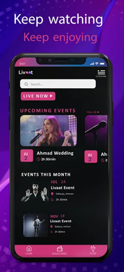 Upcoming events are categorized in an orderly manner for you to browse through easily and select the ones you like. Replays are also organized sequentially for your ease of use. Tell your friends about LIVAAT so that they can also join you and enjoy the live streaming experience as more and more celebrities and artists are joining the platform and getting ready to perform for you, for your family and for your friends. It is truly a redefined experience of live shows. Have a great time and enjoy many memorable moments on LIVAAT.