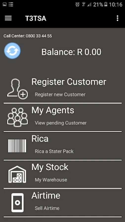 Users of the application would be able to register mobile network operator SIM Cards for subscribers in accordance with the RICA act, if the user is a registered Rica Agent with T3TSA. The application also allows the user to sell Airtime/DATA/SMS and Electricity through his mobile wallet.