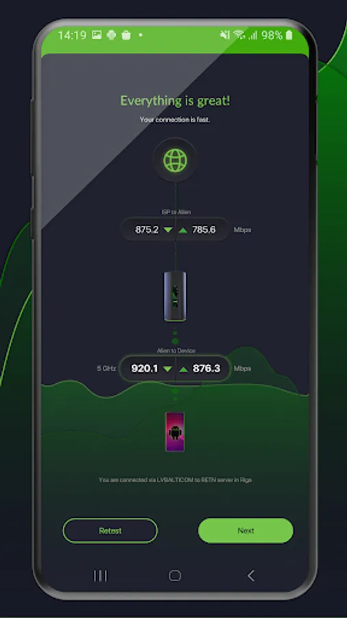 View key diagnostic information, like a connected devices summary, upload/download activity, your IP address, and real-time network speed data.