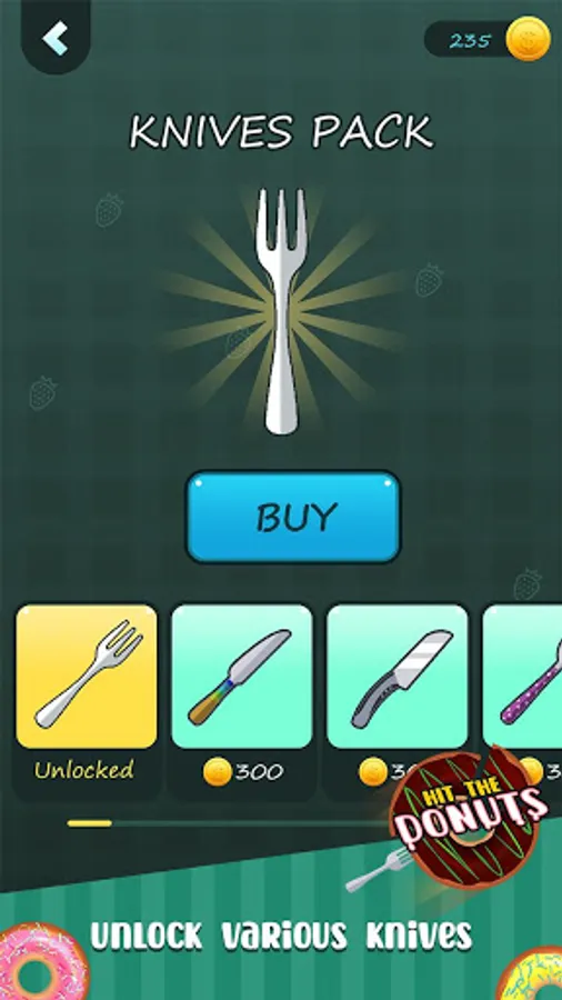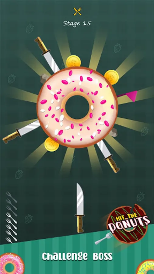 The donut will rotate irregularly, sometimes fast and sometimes slow. Through the control of the tableware, touch the screen to throw the tableware out, avoid overlapping, and at the same time, you can hit the surrounding gold coins and exchange the gold coins for a variety of tableware. If there is an overlap, the level will fail and you need to start again until all the utensils on your handle are inserted on the donuts before you can clear the level.