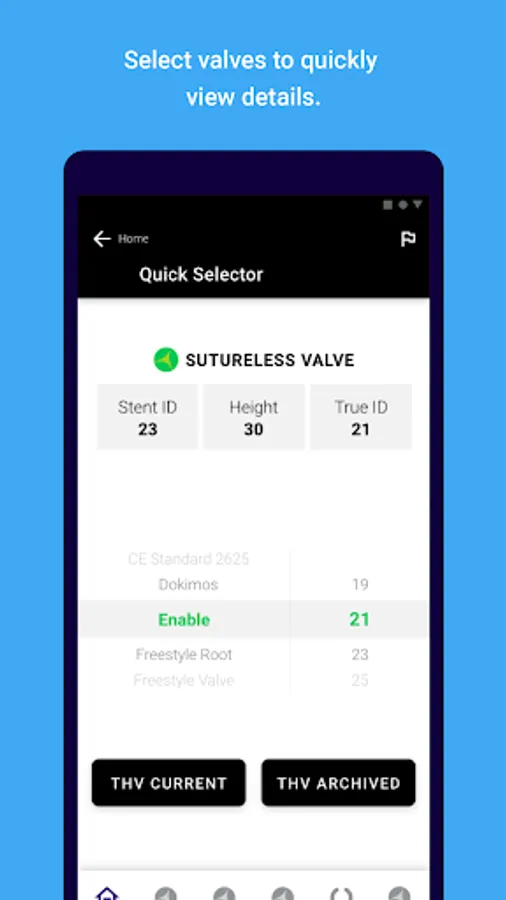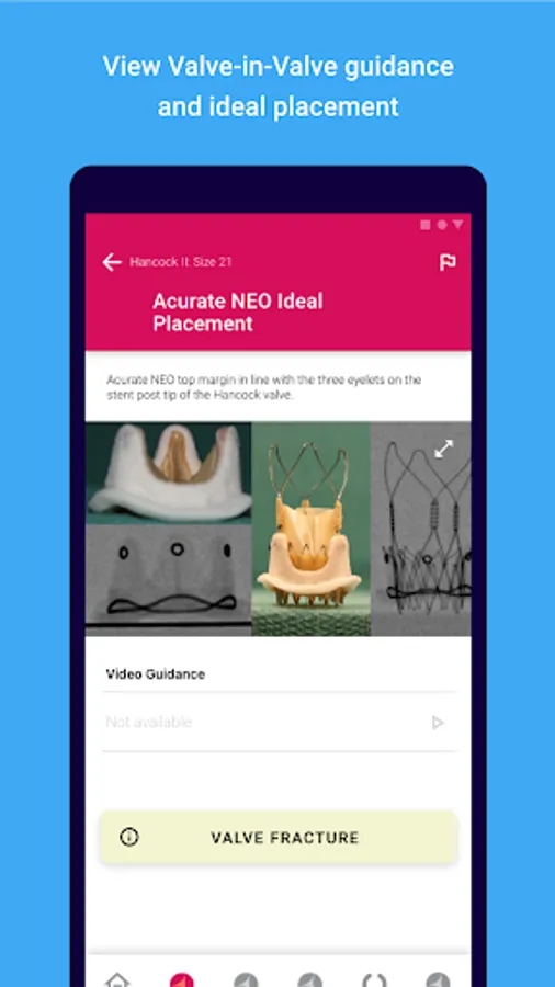 Valve in Valve app provides information specific for a clinical scenario, quickly and simply. This will help in the planning of and performing a Valve in Valve case. The application navigates the user through important aspects of surgical and TAVR valve design, which are vital for a successful Valve in Valve procedure. The app logically steps through the possible combinations to give the user specific information needed to perform the procedure.