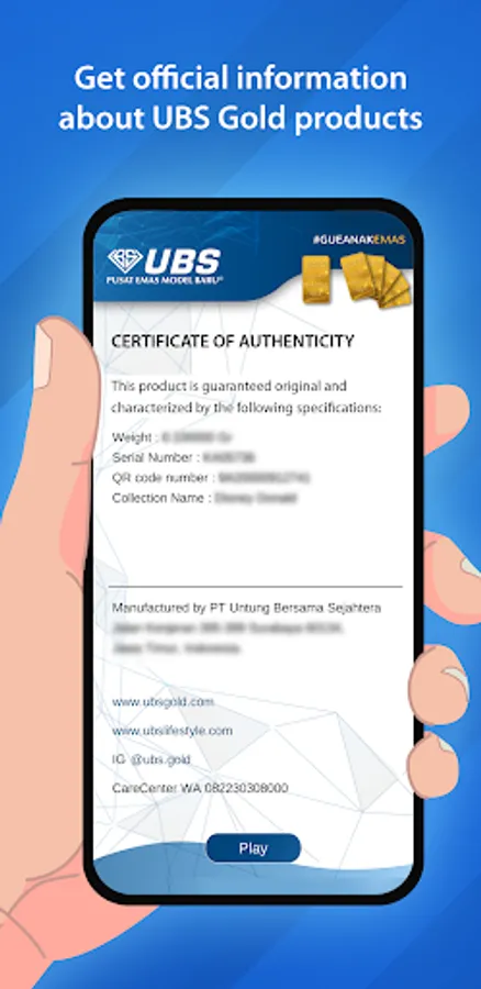 UBS Scan & Sure adalah alat otentikasi produk perhiasan emas dan logam mulia UBS. Cukup dengan memindai QR code yang terdapat pada kemasan produk, secara instan pemilik produk dapat memastikan keaslian produk yang dibeli/ dipunyainya.