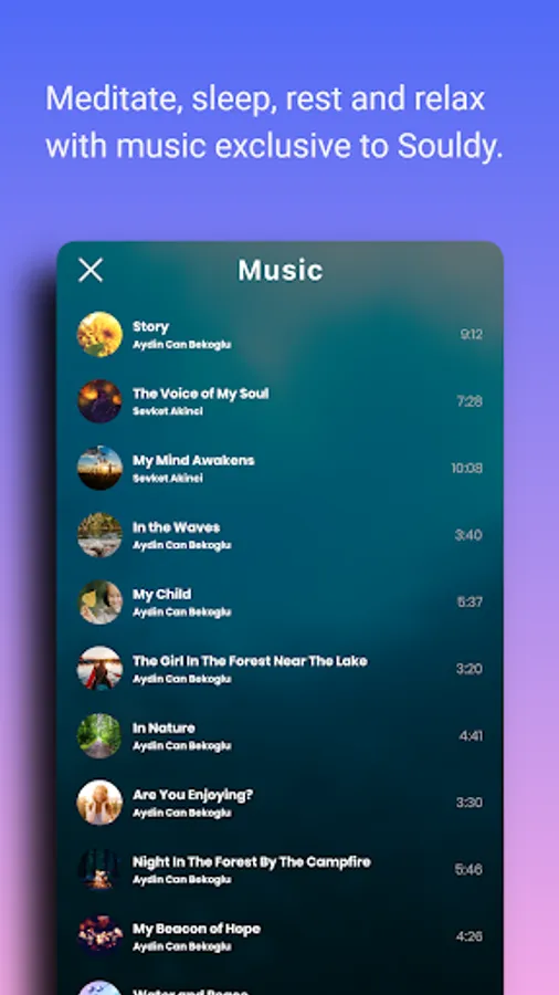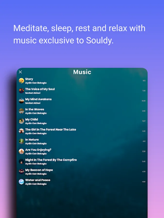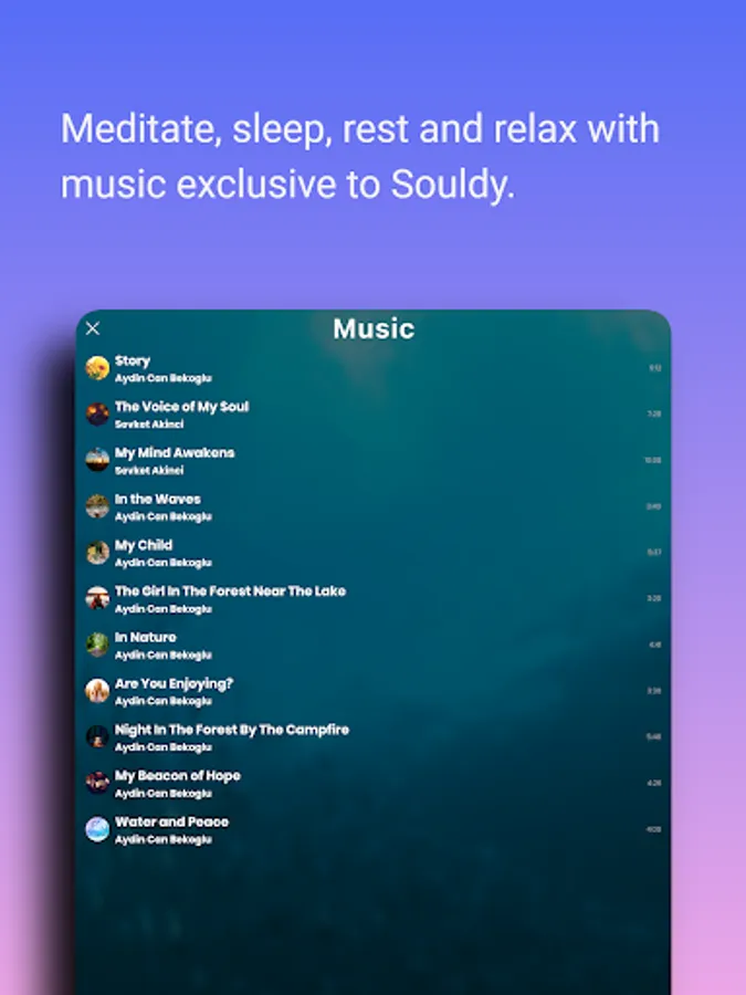 In our music section, you will find peaceful music blended with sleep sounds, relaxing sounds, meditation music, calming sounds and nature sounds (water sounds, ocean sounds, rain sounds) prepared by competent masters only for Souldy app.