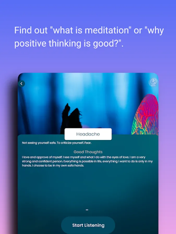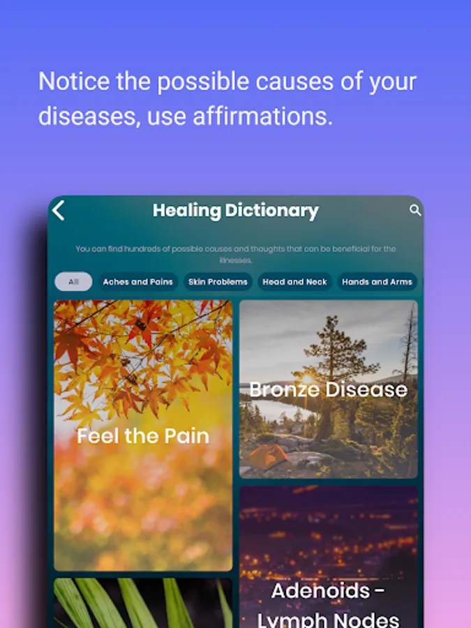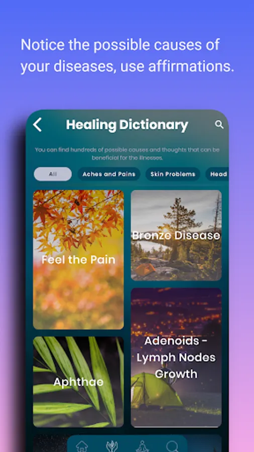 We have prepared hundreds of possible mental causes of diseases and affirmative sentences that can be good for these diseases. We offer peaceful meditation, mindfulness exercises and breathing exercises, which we think will be a very important tool to get rid of diseases and create awareness. We share hundreds of studies on many subjects such as pain, skin problems, sleep problems, respiratory problems, stomach disorders, weight problems, mind body problems and pediatric diseases to support your healing process.