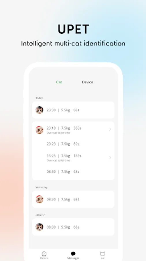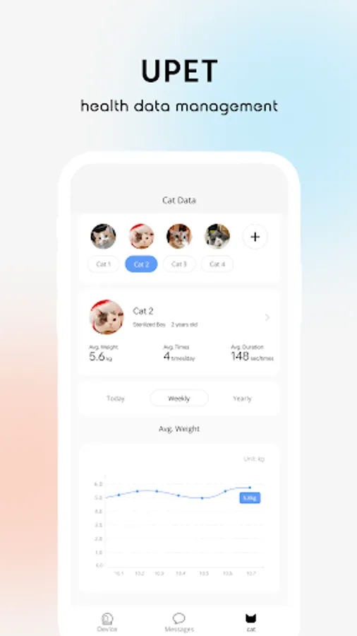[Health data management] Monitor cats' weight and toileting time around the clock, periodic data push, combined with multi-cat identification, make the cat's toileting health data management more accurate, just open the APP, you can instantly understand the cat's toileting health situation.