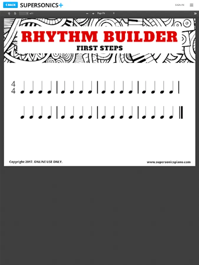 Rhythm Builders: Every piece in the Supersonics Piano Method has a Rhythm Builder worksheet associated with it. These sheets drill the rhythmic elements of the piece. You can use these online for free.