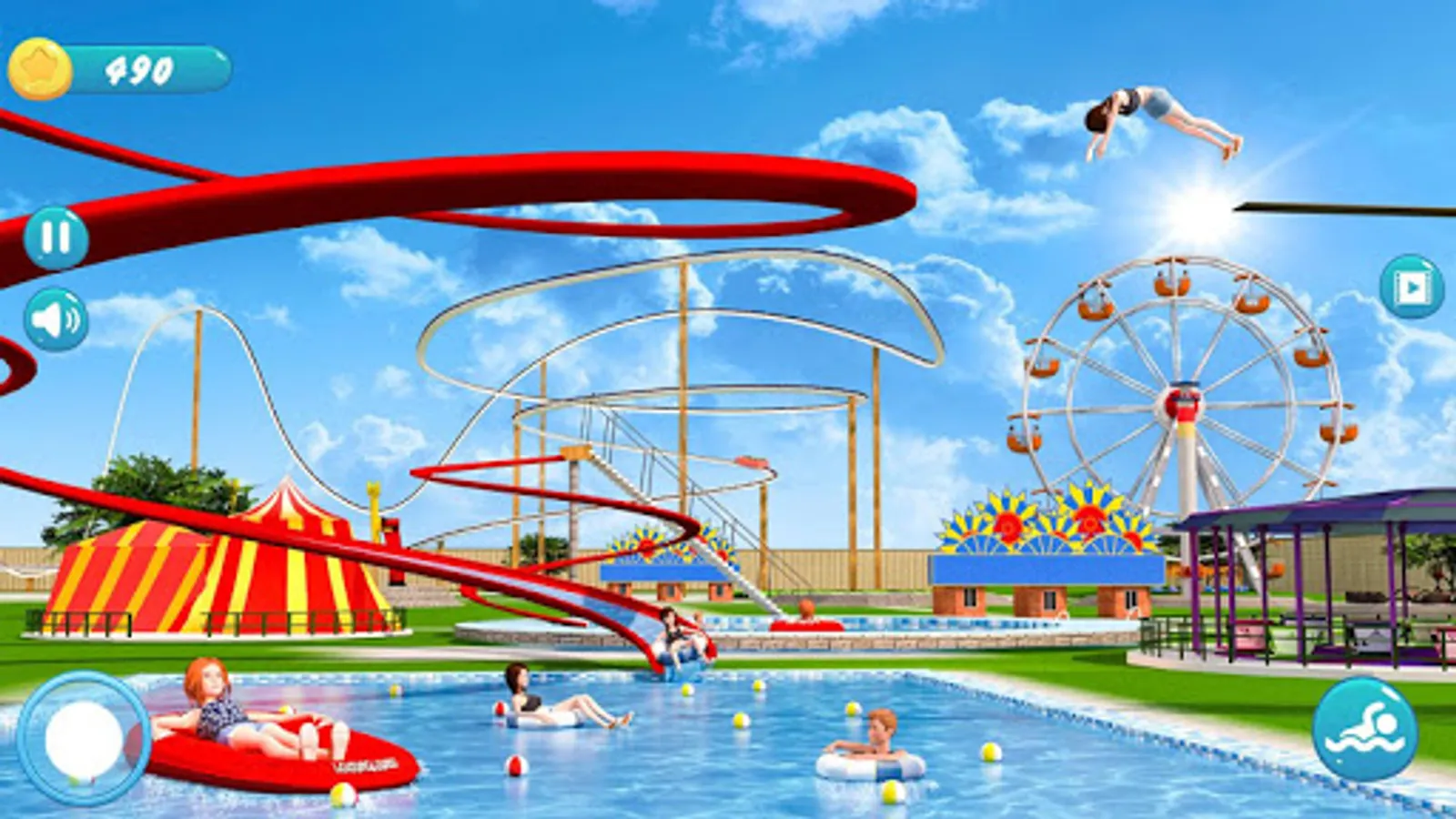 Water slide games consist of many amazing water slides and many other aqua park joy rides unlike you have seen in any of the other water park games. In this unique theme park games you can enjoy a high jump into the watery swimming pool or you can go and buy yourself a ticket to the roller coaster and enjoy on the trails of the roller coaster for extreme amusement park games pleasure nothing like in other rollercoaster games. If you want to enjoy a pool party in the summers then what are you waiting for ? jump into the swimming pool and play water volleyball or just hang around for a while without having to go to the pool. Swimming pool games also offer you the chance to get a free ride on a ferris wheel and see the theme park from a bird's eye view. If you are a fan of a carousel then this one is a must download for you. There are many other water parks and amusement rides waiting for you just a tap away. So stop wishing and download now for a virtual amusement theme park visit.