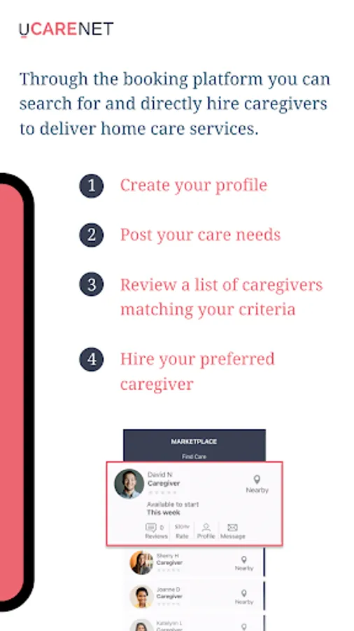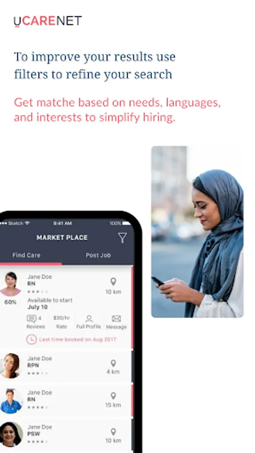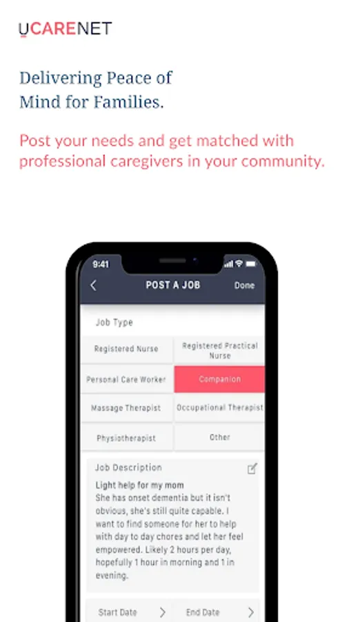 uCareNET places the control, choice, and flexibility in the hands of Families and Care Providers. With uCareNET you can connect, communicate, and contract with ease. uCareNET keeps care providers connected with families, and notifies them of new job postings. Families can search for Care Providers based on location, skills, languages spoken, interests, and more.Care providers can create their searchable profile, list their availability, and service offering. Care providers can customize their profiles and services for better matching.