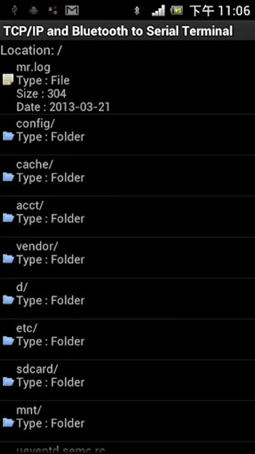 Bluetooth SPP & TCP/IP Terminal is the terminal emulator via Bluetooth, WiFi or Ethernet to serial port profile communication. The portable Android devices can connect with the remote Bluetooth devices supporting Bluetooth Serial Port Profile (SPP) or TCP/IP which will exchange data with them bidirectional.