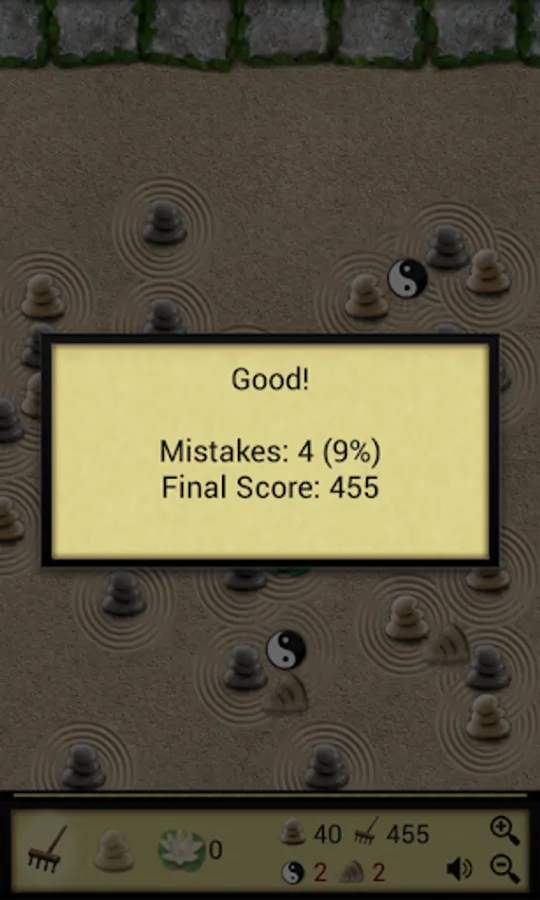 Your task is to open all empty cells and put the stones to the cells with Yin-Yang symbol (You should put a stone before open the cell). However, unlike Minesweeper, the game does not end on the first mistake, but you will get penalty. Wrongly placed stones can't be removed, you also will get penalty for them.