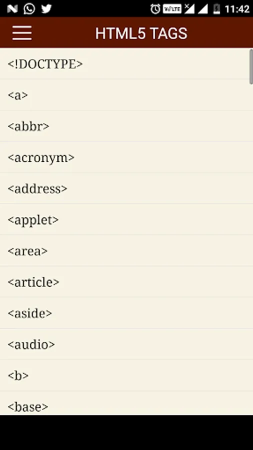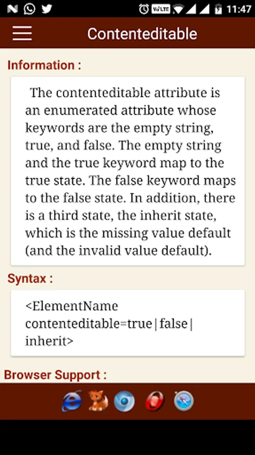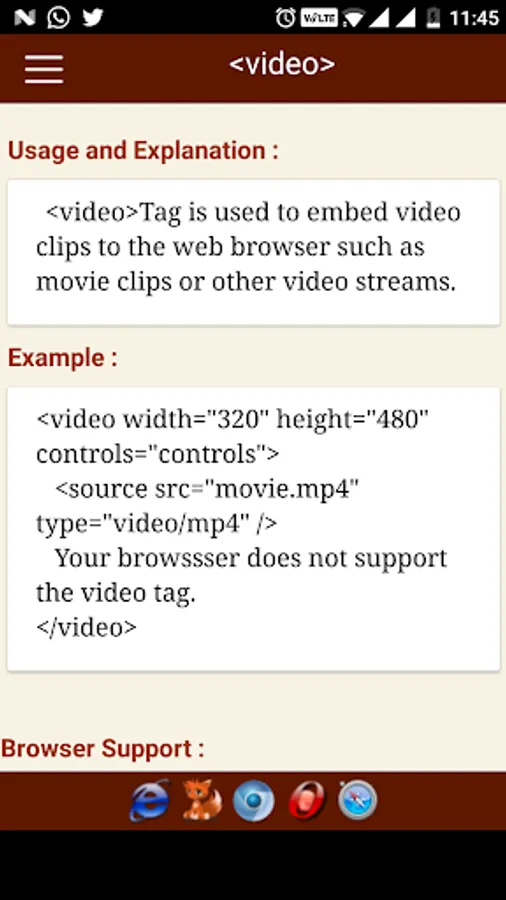 The HTML tags are categorized and searchable. Each tag information screen contains a description, element specific attributes, examples, browser compatibility, and version information. In addition, many of the examples include the actual rendered output.