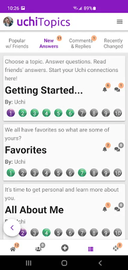 ANSWER - Uchi’s Q&A platform prompts you with fun, inquisitive and thought-provoking questions so you can share your perspectives about the world. UchiTopics (all free) are composed of 10 questions which you can pick from and answer, or not, in any order you want.