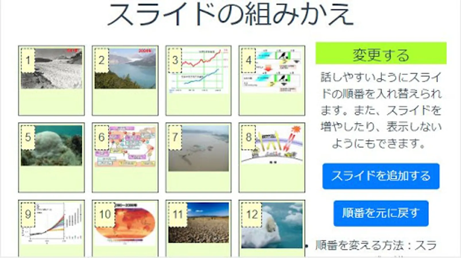 "What is Global Warming?" Is a slide show on global warming, where you can learn more about global warming. You can also build your own slideshow by rearranging and adding slides. The slides you create can be shared with others, and the teacher can give the children the original content of the lesson for learning.