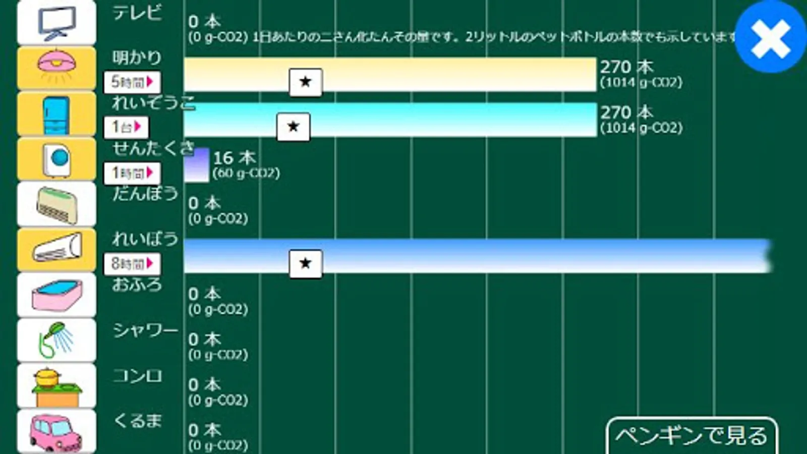 In "Save Penguins", you can learn how much global warming progresses by using home appliances used at home while watching the movement of penguins. You can also learn how to reduce it by using it wisely.