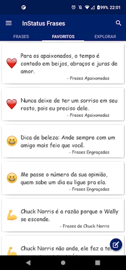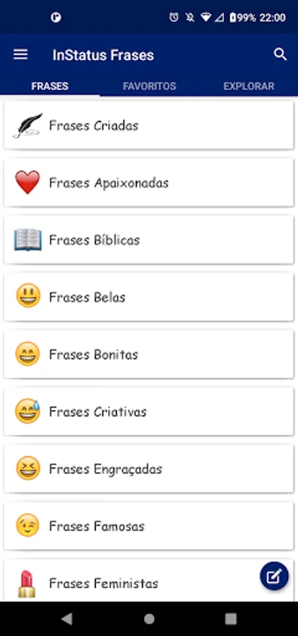 There are more than 100 categories of Phrases, such as Funny Phrases, Phrases of joy, Phrases of Sadness, etc. In addition, this app also has several commemorative date phrases such as phrases for Mother's Day, birthday, etc.