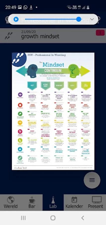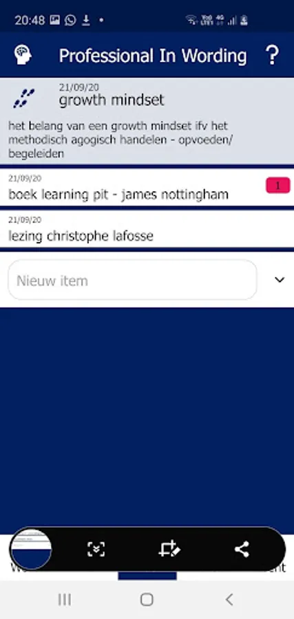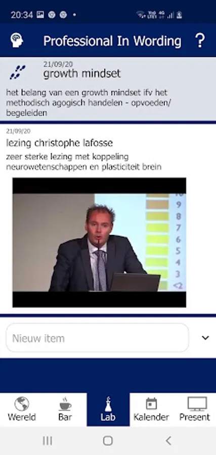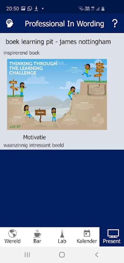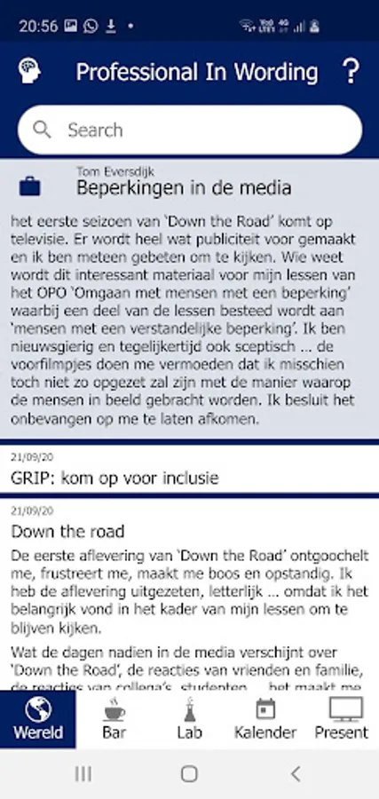 The function "lab" is a private development place where your own themes can grow and mature. In "bar" groups are created to discuss each other's ideas, to offer each other input and reflection. In addition, through the function "world" and "calendar" proposals for collaboration and coming together can lead to cooperative behavior. Learning from and with each other without clear direction or coaching and without judgment. In the "presentation" part, impressions are collected that give meaning and gave to their development as a youth professional. The PIW-App is part of the program's ambition to install authentic motivation, committed and lifelong learning among our future youth welfare workers.