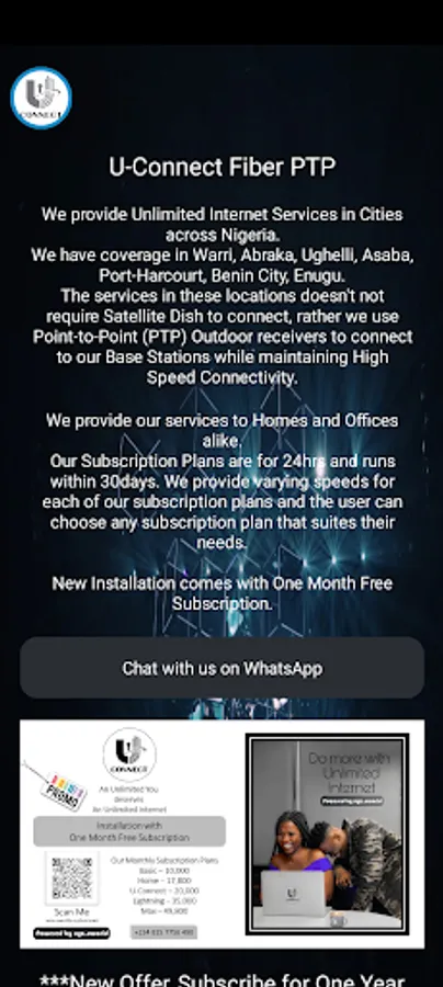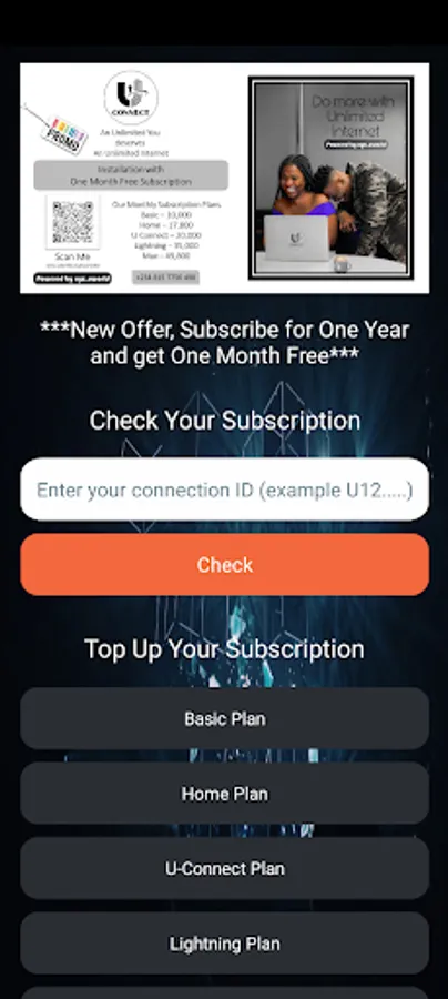 This App enables our customers to subscribe to their Unlimited Internet Access. It also allows our customers to check their subscription status, Top-Up their subscription.