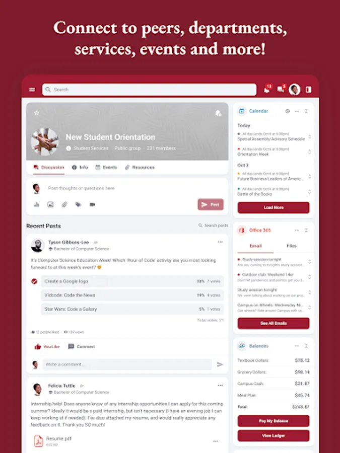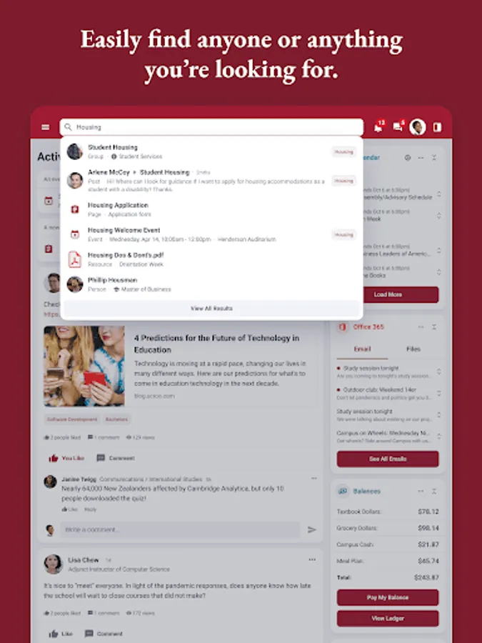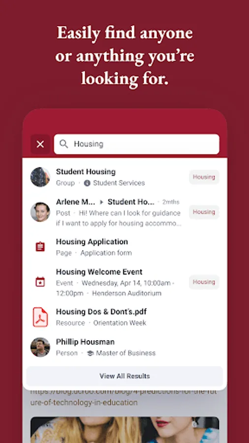 - Search staff, peers, systems, groups, posts, resources, and more.