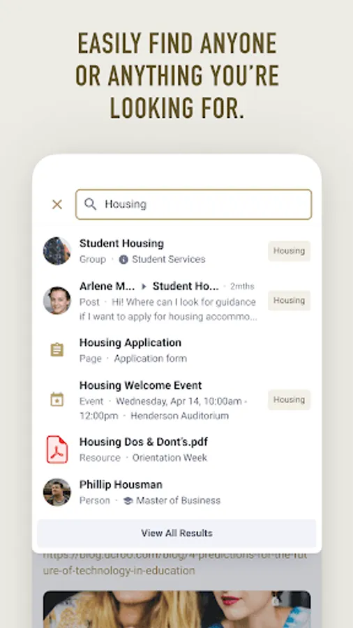 - Search staff, peers, systems, resources, and more