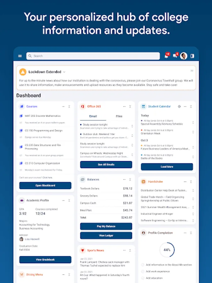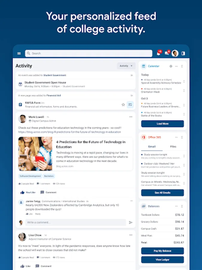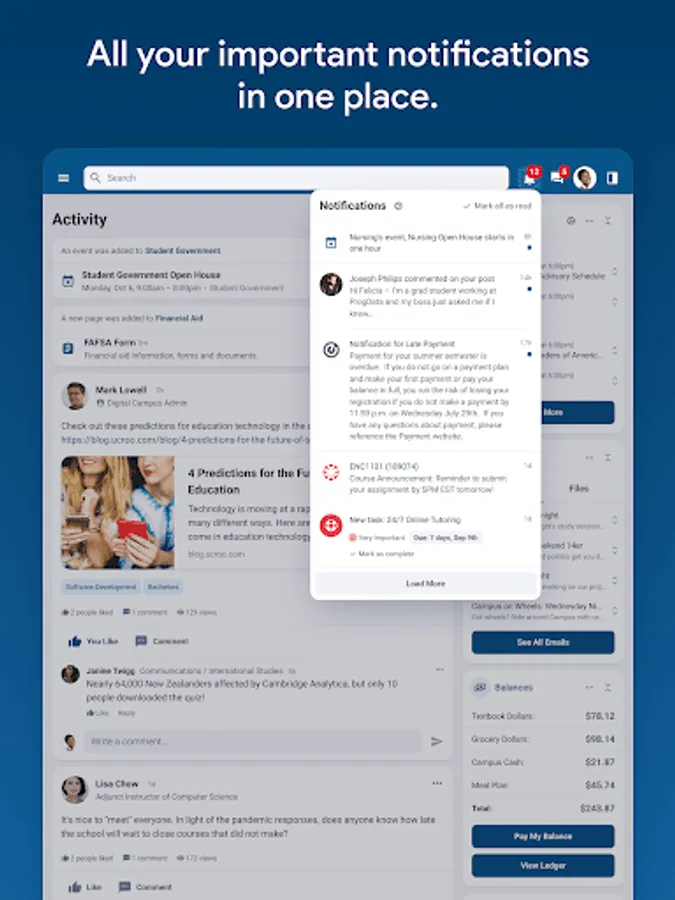- Focus on your important to-dos, announcements, alerts, and content