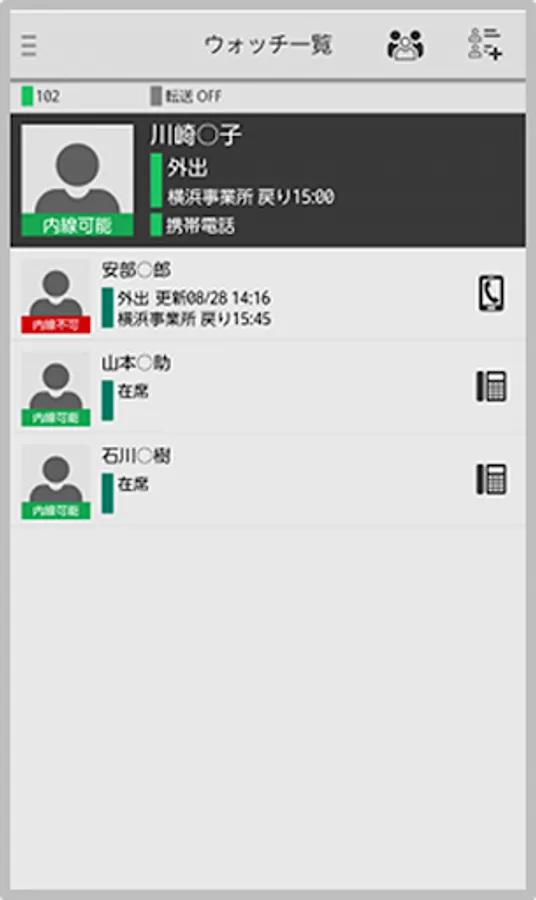 ・プレゼンス表示:在席/外出先/帰社予定時間/帰宅等を一覧形式で確認することができます。