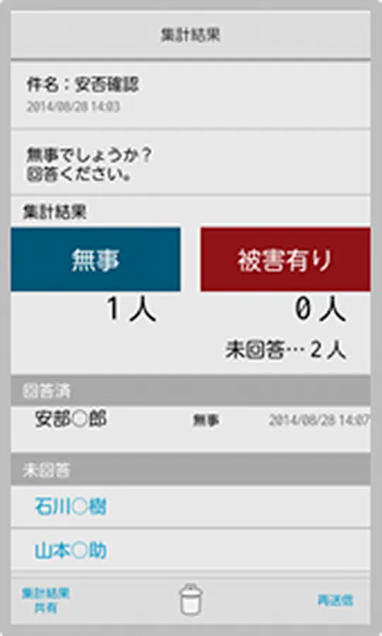 ・安否確認/賛否確認:災害時等に、メンバーの安否を確認するメッセージを送信し、自動集計することができます。