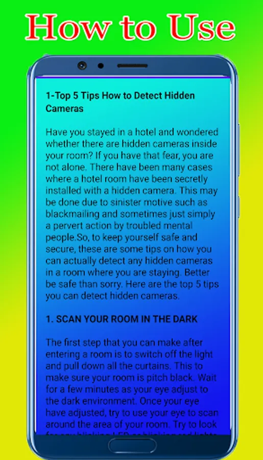 We develop this Hidden Camera Detector and Electronic Device Detector help to solve the major problem to detect Hidden spy Camera in any place where or you going outside. You can use this app to detect any such kind of hidden electronics devices.