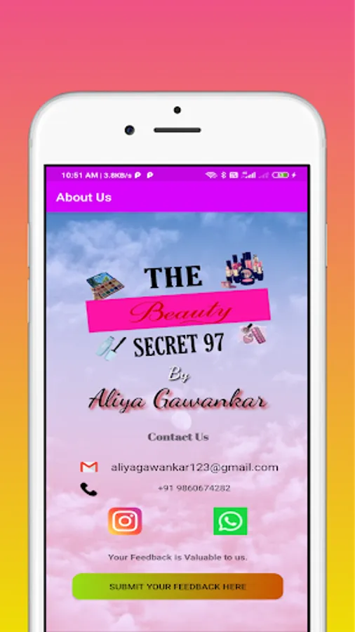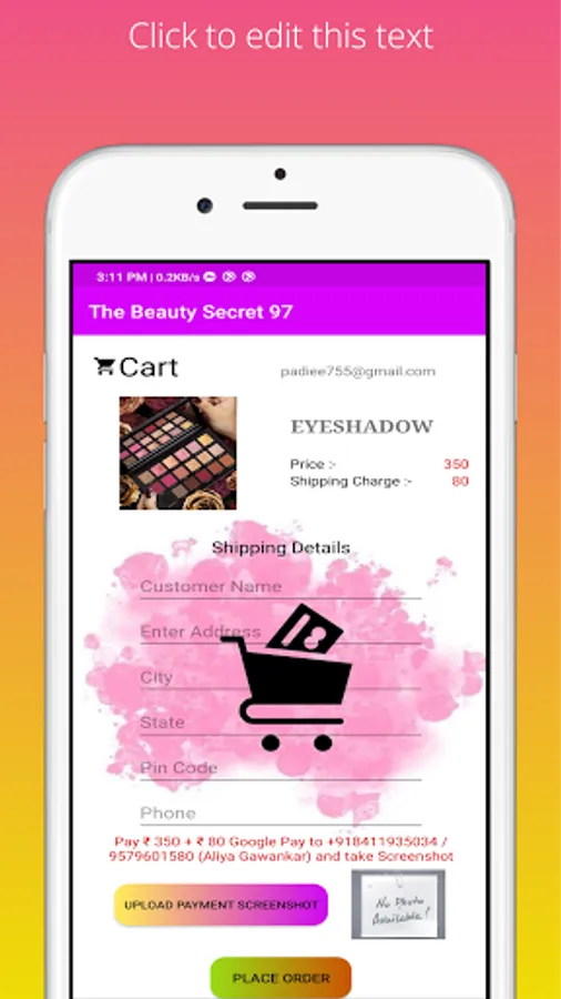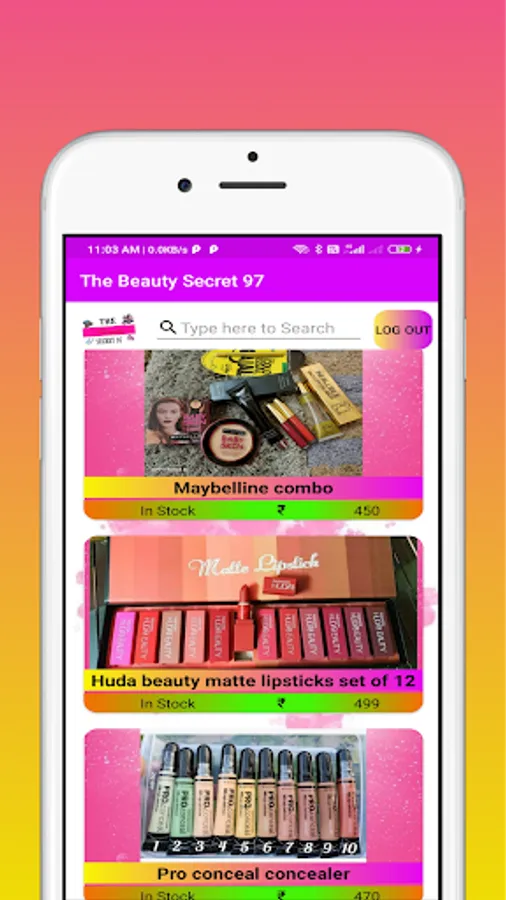This app has the features to purchase various ladies items such as Makeup kits, Various Beauty Products and also various Makeup Accessories such as Brushesh,Vanity Boxes. once you signed up or logged In to the app, List of all the products will appears on the screen with its Price. You can see its description by clicking on image. and there you will get option to purchase the product by Clicking on Buy Now.To place order You have to fill Shipping adddress and upload Payment Screenshot. Using official Instagram handle of The Beauty Secret 97 by Aliya Gawankar and Whatsapp by direct contact with seller you can track your orders.