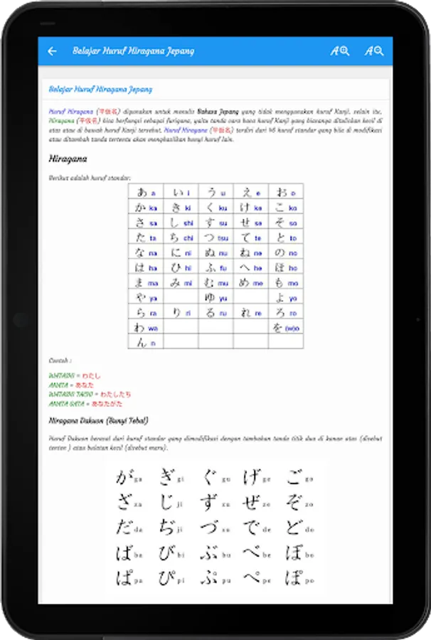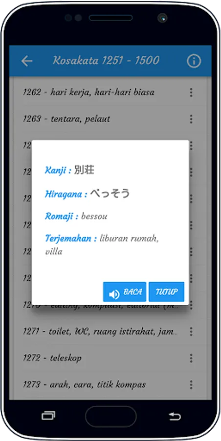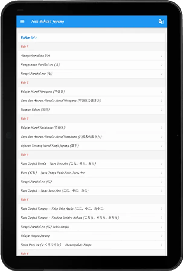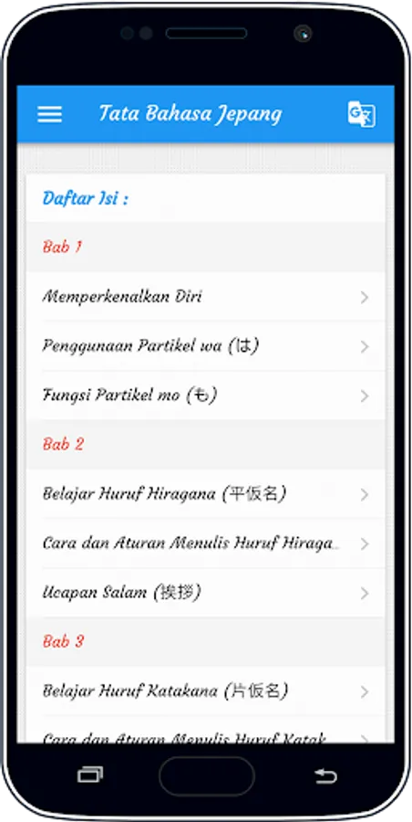 Japanese Grammar app has a collection of 1500 vocabulary writing kanji, hiragana, romaji, and an Indonesian translation, all can be learned in this application.