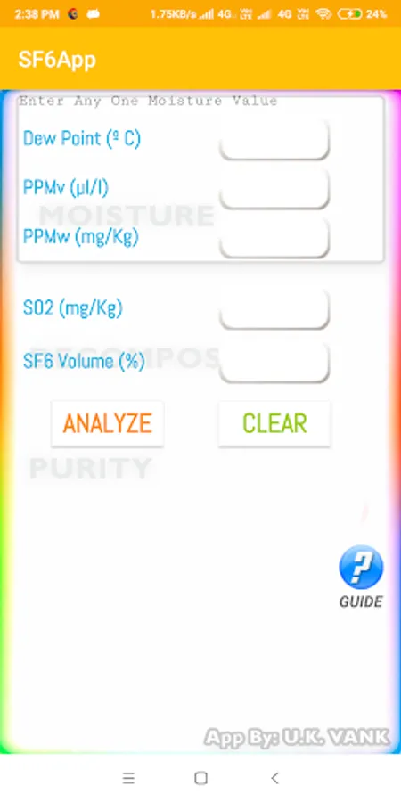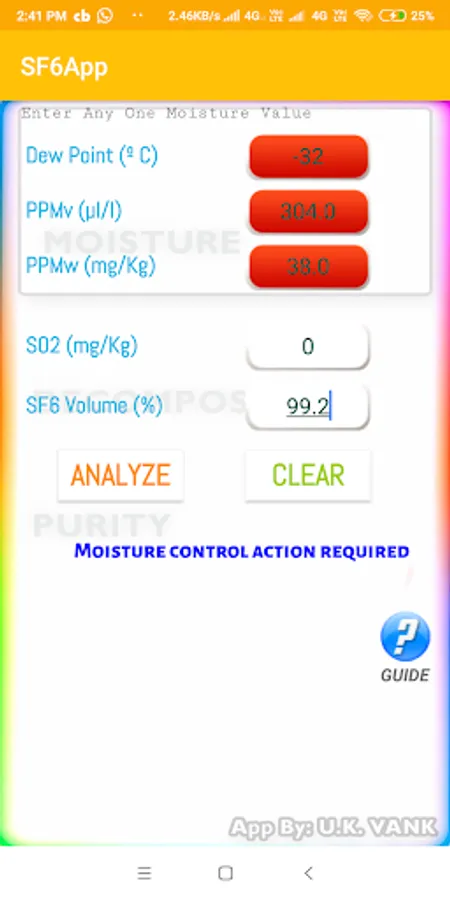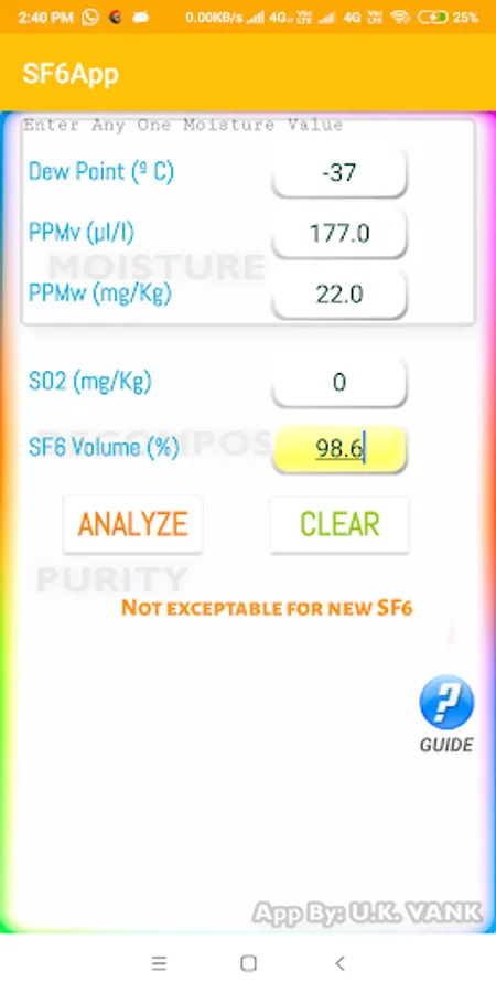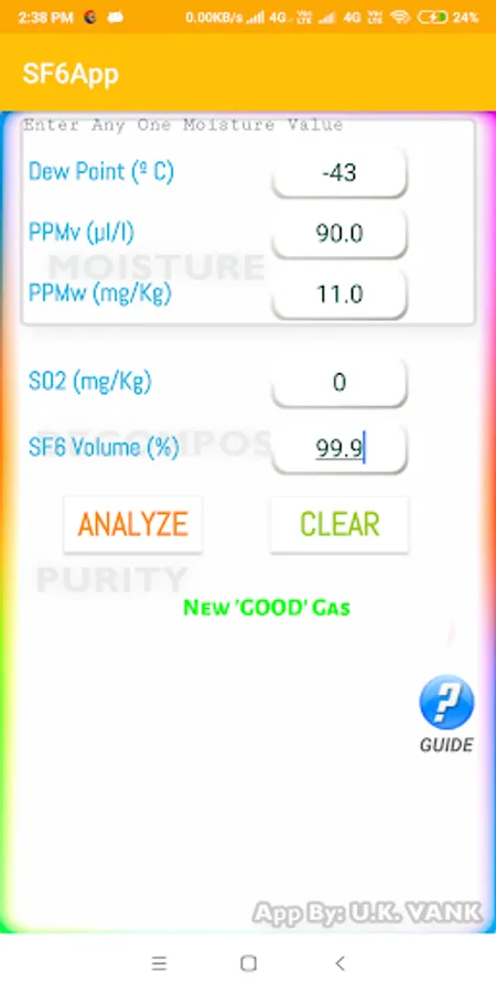 Application is built by studying guidelines of various international standards(IEC 60376/60480, IS 13071/13072, IEEE 1125, CIGRE 234/576) and other insightful papers. Application should help filed engineer interpreting results measured by SF6 testing instrument and action required (if any). however, final decision should be made considering other important factors and agreement between costumer and equipment manufacturer.