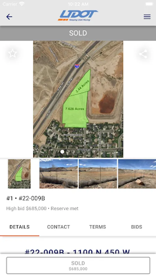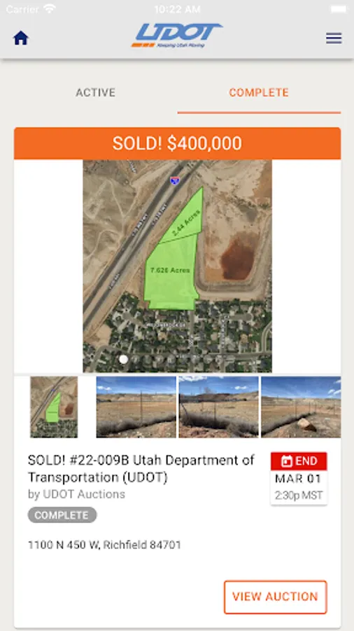 Welcome to the UDOT Auctions' mobile bidding app! This dynamic app allows you to (1) stay informed about our upcoming auctions; (2) view properties that interest you; (3) get notifications when you’ve been outbid; (4) bid no matter where you are located (or set and forget your maximum bid to let our platform automatically bid the lowest possible winning bid for you). This is the go-to-source for up-to-the-minute information on all of our auctions and listings.