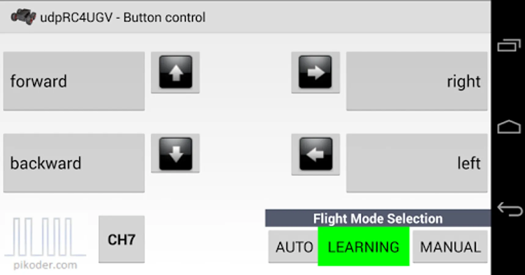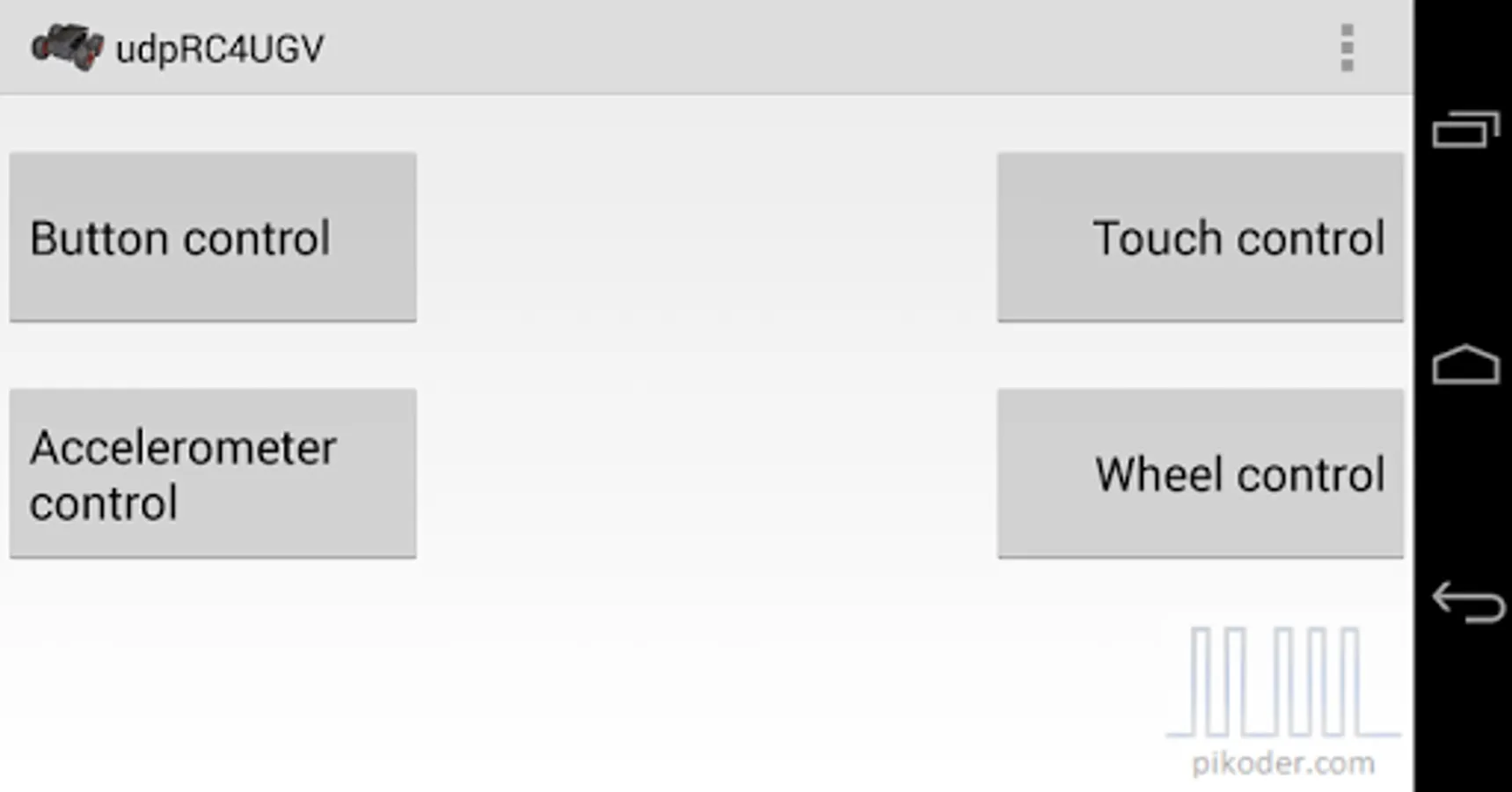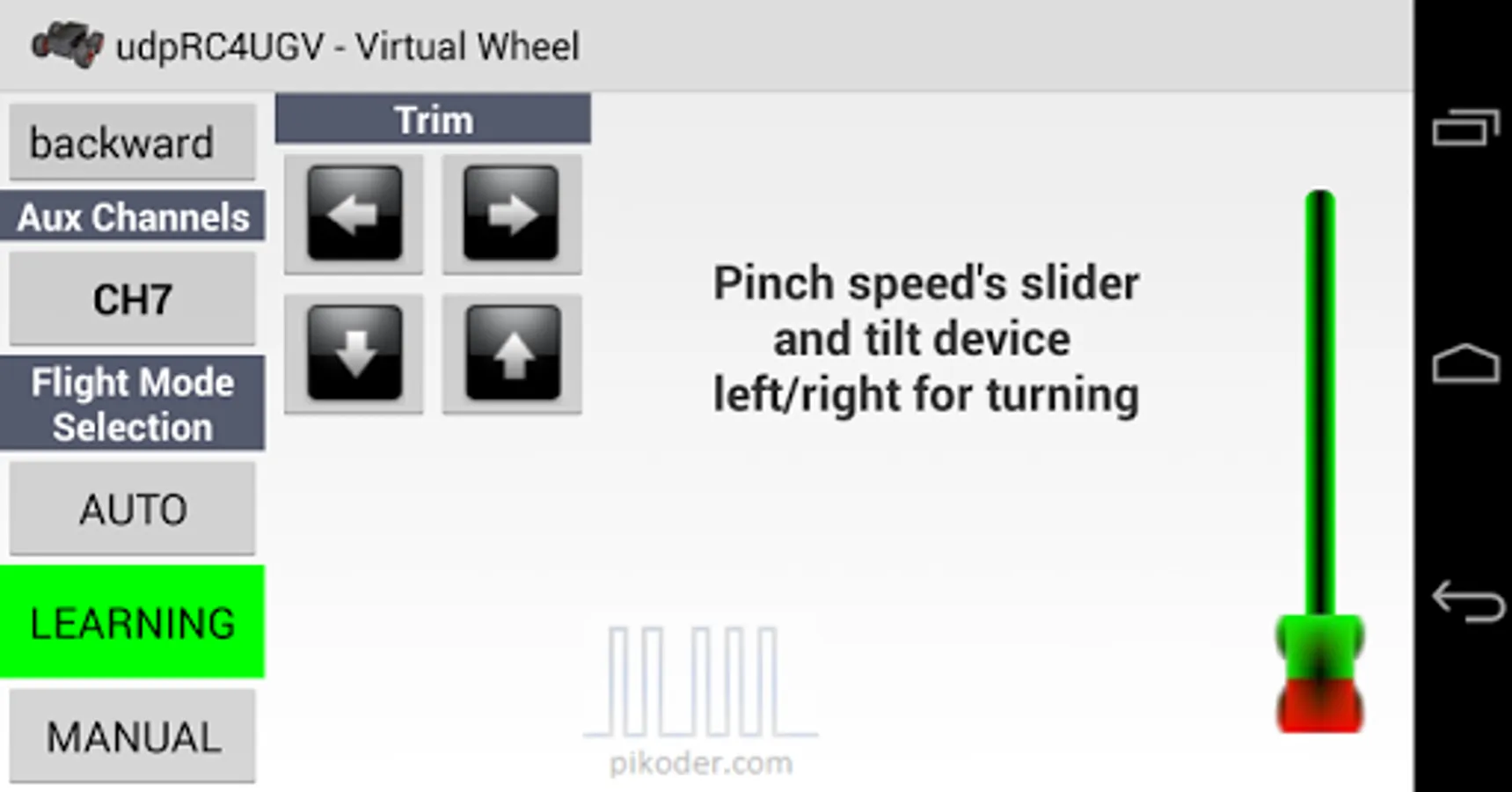 This App turns an Android device into an R/C transmitter for a rover with an Ardupilot Mega (UGV) or a similar autopilot. A PiKoder/SSC wRX receiver replaces the traditional R/C receiver as an interface between the smart device and the autopilot.