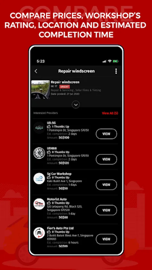 You get to compare the prices, workshop’s rating, location, and the estimated time for the job to be