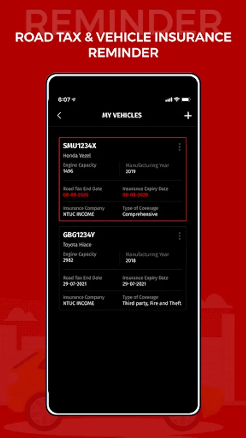 Get notified before your motor insurance and road tax is about to expire. You will never miss the