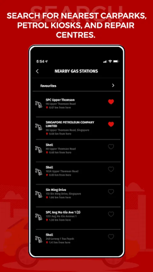 search for Carparks, Petrol kiosks, and Repair centres based on your current location.