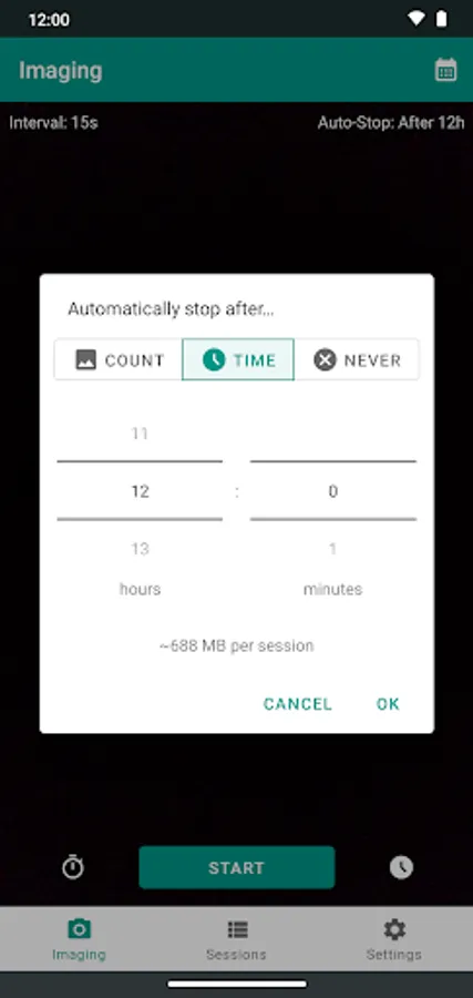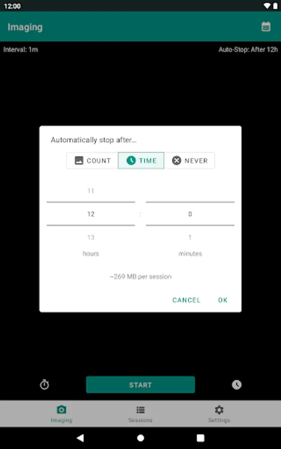 • Let the session run indefinitely, or stop after a certain number of images have been taken or amount of time has passed