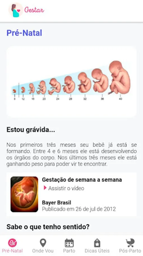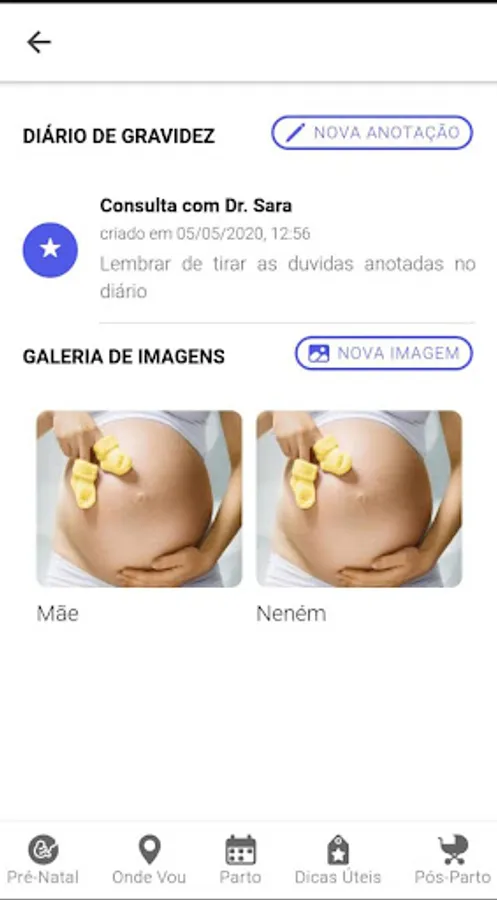 This application is the result of a Master's thesis developed by the national family health network (RENASF / UFC). It aims to contribute with guidelines and health promotion for pregnant women and is organized in main menu and submenus. The main menu, called agenda, contains varied guidelines. In the Prenatal tab there is information regarding the evolution of pregnancy, exams and other topics. The distances to the basic maternity health units are shown in bom de vou. Useful tips include information on the rights of pregnant women and common questions during pregnancy; and in the postpartum tab, care for the mother and baby