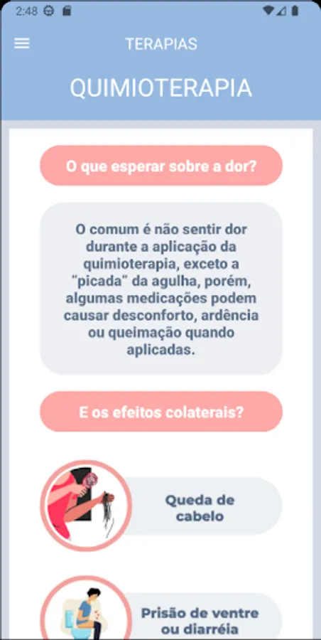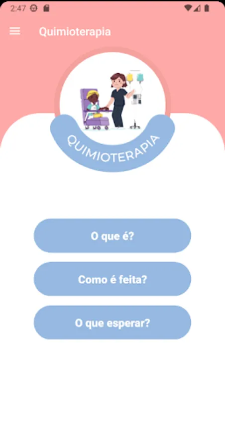 This application contains information about cancer and its main treatments, chemotherapy and radiotherapy, as well as the main signs and symptoms resulting from them and important nutritional information for this audience. In addition, an explanatory and playful video is available to expand access to this information to children under 6 years of age or those who don't know how to read.