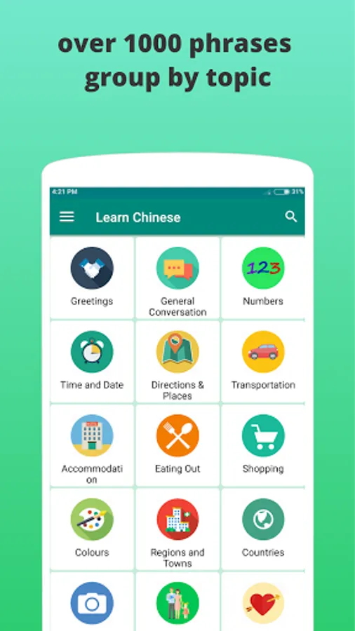 Learn Chinese Mandarin Free contains over 1300 commonly-used Chinese phrases and vocabularies for travellers and beginners in 18 categories.