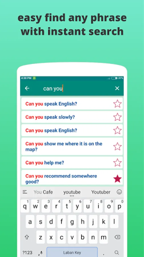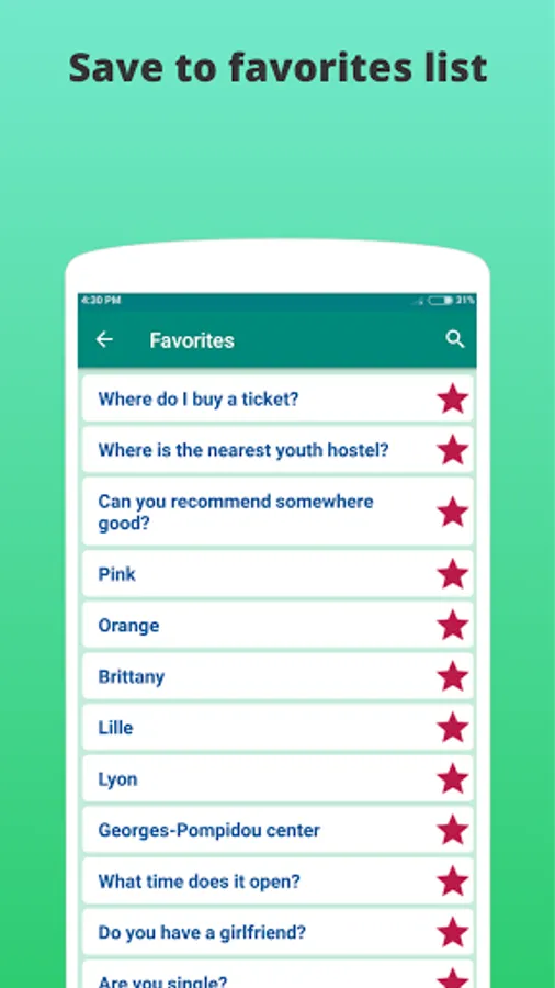 -- each phrase with speech of native speaker help you learn speak French correctly