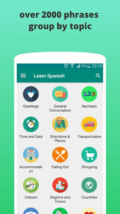 Learn Spanish - Aprender Español contains over 2000 commonly-used Spanish phrases and vocabularies for travelers and beginners in 18 categories.