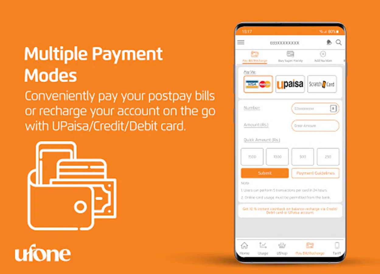 • Bill Payment/Balance Recharge – Securely pay your postpaid bill and recharge your prepaid balance via Credit/Debit Card & UPaisa wallet