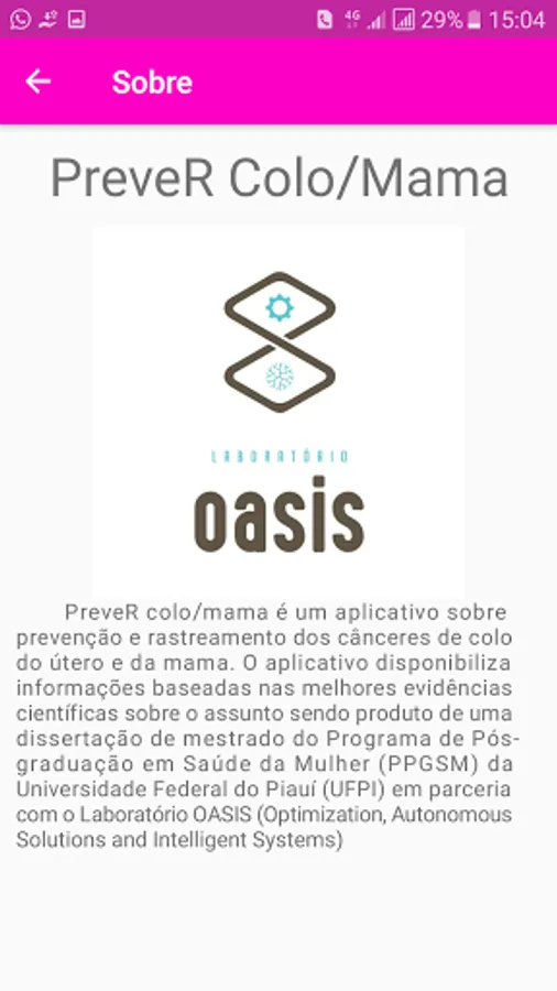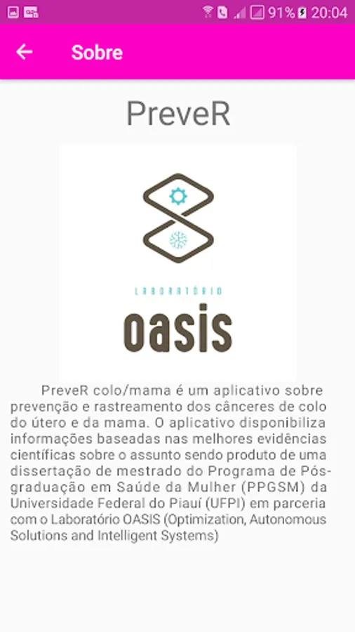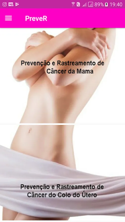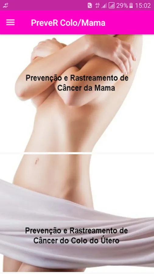 PreveR Colo / Mama is an application with recommendations on prevention and screening of Uterine and Breast Cancer for women. All information provided was validated by women's health professionals. In addition, you can use the application to make date appointments to take exams and save their results through photos.