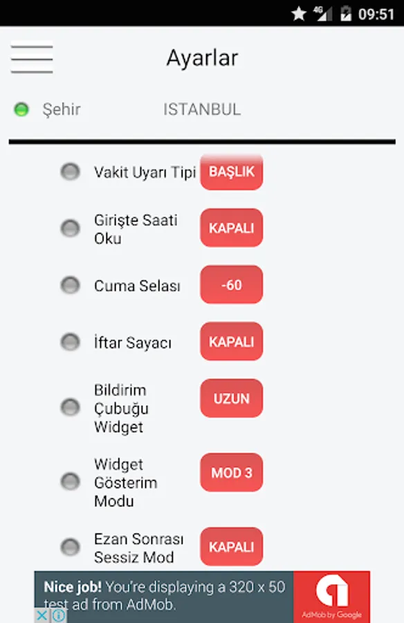 Even when the application is closed, it warns you before and during prayer times, with Azan or with different sounds and "Speaking in TURKISH".